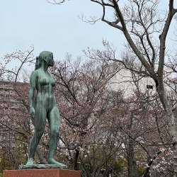裸婦像は桜を微笑んで見つめている。