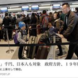 【出国税】(しつこくぜい) いよいよ財政的に行き詰まってきた安倍政権が国民からいやおうなく税金をかすめとる何かいい案はないか、しつこく税を取る方法はないものか、としつこく考えているうちに、しつこく、、税を、、ん? それだ! しつこく税だ! と唐突に思いついた税金のこと。日本から出国する人から1人千円… のら猫 寛兵衛 2017/10/28 23:46