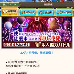 白猫プロジェクト×エヴァンゲリオン4人協力イベント第3戦 エヴァコラボ協力バトル第3戦「第10の使徒」が開催されました。開催期間は11月30日15時59分までです。 初回クリアで第10の使徒の石板 初回クリアで第10の使 […] オードリーのブログ 2021/11/04 18:24