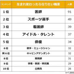 株式会社ビズヒッツは、男女1,000人を対象に「生まれ変わったらなりたい職業に関する意識調査」を実施し結果を発表した。 男女1,000人に「あなたが生まれ変わったらなりたい職業は?」と聞いたところ、1位は医師でした。 … MENTALW 2021/12/30 09:25