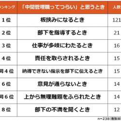 株式会社ビズヒッツは、中間管理職の経験者238人を対象に「中間管理職がつらいと思う瞬間に関する意識調査」を実施し結果を発表した。 「中間管理職がツライと感じる瞬間」について聞いたところ、ダントツの1位は「板挟みになるとき」でした。 … MENTALW 2021/11/09 06:54