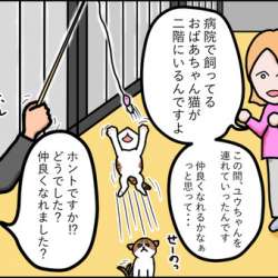 途中からの方はこちらからどうぞ❕『ボロボロの子猫①』入院生活ユウの入院生活が始まりました。週に1、2回はユウに会いに行きました。最初の頃はケージ越しに触れ合っていました。看護師さんから「うちから持って来たんですよ」と言われて渡されたのが、オモチャの猫じゃら... クロスケのねこまんが 2021/01/31 06:41