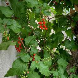 ジュズサンゴ 先日、巨大になっていたジュズサンゴの事を書きましたが 家主さんがお隣の銀杏を選定してくださったおかげか もっともっと元気に赤い実をつけていました。 母はよく、みんな鳥に食べられてしまう、とぼやいて居ましたが ここは車のけっこう通る道に面している為か 赤い実は無事です。 美しい赤の実。 … ガジャのねーさんの 空を… 2024/11/02 06:10