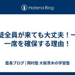 岡村塾は 生徒全員が同時に来ても座れるように 1人1席方式 を採用してる変わった塾? 普通は 1つの教室を 時間によって生徒を入れ替えて使うやん? でも うちの塾は違うねん 各学年・各クラスの教室を固定して 1人ずつに1席を用意してる その子専用の座席があるってことやね? だから授業がない時に来た… 塾長ブログ 岡村塾 | … 2024/09/10 20:20