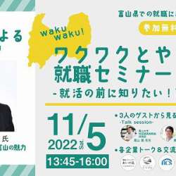 富山県が、富山県での就職に興味のある学生や若手社会人を対象に、「ワクワクとやま!就職セミナー」を11月5日(土)にオンライン開催する。 新田知事をはじめ、先進的なゲストによる講演や、富山県を代表する企業との交流会、就活生向けのキャリアワークショップを行う予定… MENTALW 2022/10/27 05:55