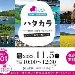 11月5日(土)の10時から12時30分まで、高知市と幡多地域6市町村(四万十市・黒潮町・三原村・宿毛市・土佐清水市・大月町)の先輩移住者が登場するオンライン移住体験ツアー「ハタカラ」が開催される。 参加者(定員30名)の方には、高知市と幡多地域の特産品をプ… MENTALW 2022/10/30 05:50