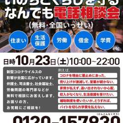 コロナ災害を乗り越える いのちとくらしを守る なんでも電話相談会実行委員会は、10月23日(土)に新型コロナウイルス感染症の影響による生活困窮者向けに、住まい・生活保護・労働・借金などに関する無料電話相談会【第10弾】を開催する。 新型コロナウイルス感染症の… MENTALW 2021/10/21 21:05