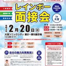 埼玉県が勤務地の30社が参加する女性・男性、若者からミドル・シニアまで様々な人をつなぐ虹の架け橋となる「レインボー面接会」が2月20日(日)大宮ソニックシティで開催される。 開催日 2月20日(日) 開催時間… MENTALW 2022/02/15 06:45
