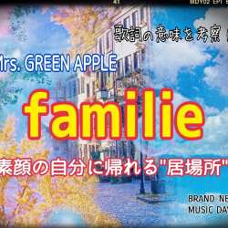 【メンタルエイド】 BRAND-NEW MUSIC DAYS 今回あなたの心に届けたい楽曲は Mrs. GREEN APPLE の familie です。 この記事では「familie」について 楽曲全体のイメージや歌詞 […] 関連記事 【Mrs.GREEN APPLE】ライラック~歌詞の意味を考… NON SEALD 2024/08/12 16:30