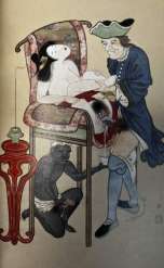 長崎、娼妓を高い椅子に座らせ致すカピタン。椅子の下にはカピタンの従者が、自身のモノをしごきながら、娼妓の淫水を瓶に受けている! 珍品ですね!