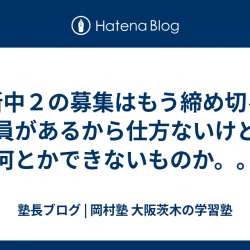 新中2は2クラスあるんだけど もう2クラスとも定員になるな。。 募集を締め切るしかないのかぁ。。? 夏までにはオンライン受講生を 募集開始する予定だけど 今来てる子たちは対面で来てる子たちだから オンラインに切り替えるとも思えず さてどうしたものか。。。 岡村塾を検討しておられる 新中2生の方は … 塾長ブログ 岡村塾 | … 2024/04/01 18:49