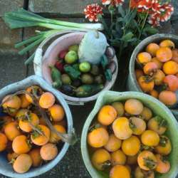 今日の収穫のうち、渋柿2バケツ分約100個とトウガンは、今日中に3人の方に差し上げました。残りの渋柿は、皮をむいて干し柿にします。イチジク、ピーマン、ナス、キュウリ、ネギは人に差し上げられるようなものではありませんので自家用です。赤いダリアは、仏壇用です。... 「いのち輝き塾」…人が輝… 2022/11/05 20:59