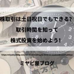 土日祝日、年末年始、長期連休に株取引はできる? 土日祝日、年末年始、長期休暇(GWなどの連休)は、株取引ができません。 例として、2021年のGWでは以下のようになっていました。 ×:4/29(木) ... Copyright © 2022 ミヤビ屋ブログ All Rights Reserved. ミヤビ屋ブログ 2022/05/03 19:00