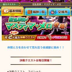 史上初!2人協力決戦クエスト【狂乱怒涛!マスティマ・メロ】 史上初の2人協力決戦クエストが登場しました。ボスはマスティマ・メロです。チェンジアタックでダウンを狙えるようです。 マスティマ・メロの石板 メダル5000個集め […] オードリーのブログ 2022/05/03 20:01