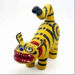 入手日:1995年5月3日入手場所:本家大黒屋郡山市西田町高柴字舘野163TEL:024-971-3176高さ19cm、長さ18cmほど。三春らしく腰を高く上げた首振りの虎張り子。腰の部分に渦巻き状の柄が入っている。飛び出した耳と小さな牙は紙製。頭の上まで伸びた尻尾なども三春らしい技法で作られている… 郷土玩具の杜 2021/10/05 06:18