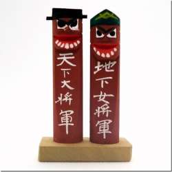 入手日:1993年入手場所:高麗神社埼玉県日高市新堀833TEL:0429-89-1403高さ10.5cmほど、茶色に彩色された木彫りの授与品。天下大将軍・地下女将軍と書かれている。 顔が無かったら面白味に欠けるけど、顔が描いてあるのでトーテムポールみたいで楽しい。郷土玩具の本に載っていた古い将軍標… 郷土玩具の杜 2021/09/20 21:36