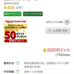 div>おはようございます☀今日はめっちゃすぐに終わるポイ活情報をお届け❣️ポイントサイトのちょびリッチより⤵️『楽天ポイントモール』200ポイント(100円相当)?条件 無料会員登録(登録時にメルマガ配信許諾が必須)?通帳 即時~10分?加算日 1ヶ月程度楽天のアカウントさえあれば1分足らずで終了… むぅブログ 2021/02/03 11:37