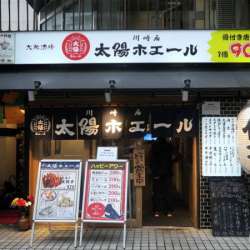 川崎駅で地元の宮ちゃんと待ち合わせ。どこの店に連れてってくれるのかと思いながら着いていくと…以前から行きたいと思っていた店だったので超ラッキー♪■太陽ホエール 川崎駅前店昼間に飲んだ「丸大ホール」の目の前にある酒場。夕暮れ時になり丸大ホールの看板にも灯りがついていた。「餃子」と大きく書かれた白提灯、… 笑い豚2 2022/04/27 19:57