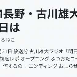 2019年12月21日 放送分 古川雄大ラジオ「明日はSUNDAY」視聴レポ オープニング ふつおたコーナー 明日はSunday、何するの! エンディング おしらせ オープニング 「年末と言えばあれですよ年末ジャンボ宝くじ」 19歳くらいの時に1回買ったけど確率は雷が当たるくらいだよね… きままにくろねこ 2019/12/22 12:46