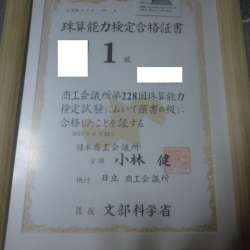 中学生の孫が、日本商工会議所主催の「珠算能力検定一級」に合格しました。長年の頑張りが報われました。 1級~10級があり、掛け算20問、割り算20問、見取り算(足し算と引き算)10問を30分間で解き、300点満点中240点以上(4~6級は210点)で合格となります。合格... 「いのち輝き塾」…人が輝… 2023/08/15 23:19