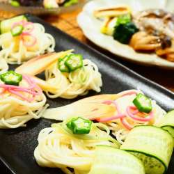 ランキングに参加してます。クリックしていただけると嬉しいです(*^_^*) 七夕の日はごはんの代わりに、ひやむぎを。 いつもはそうめんだけど、ひやむぎを買ってました。 主菜は、なすとえびの冷やし鉢&鯛の煮つけ。 油で焼いたなすは、だしがきいた煮汁でサッと煮ます。 上品な味わいに、えびと枝豆の彩りも… うちごはんはマーシャもい… 2023/07/08 00:18