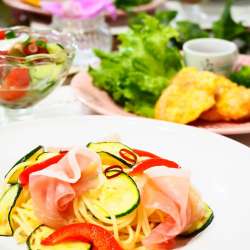 ランキングに参加してます。クリックしていただけると嬉しいです(*^_^*) 日曜日はパスタで晩ご飯。 夏野菜のズッキーニと生ハムでペペロンチーノ風スパゲティ。 オリーブ油に移したニンニクと赤唐辛子の香り、生ハムの塩けにそそられます。 チキンピカタ、たこと夏野菜のサラダを添えていただきました。 ごち… うちごはんはマーシャもい… 2023/05/29 00:19