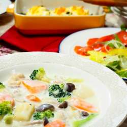 ランキングに参加してます。応援お願いします♪ 今日は久しぶりにシチュー。 豚肉とブロッコリーのクリームシチュー。 オリーブオイル+小麦粉+牛乳で手軽に、安く、とってもおいしく作れて、みんな大好き♪ そのときにある具の組み合わせをアレンジして楽しんでます。 スモークサーモンのマリネ、ほうれんそうとゆ… うちごはんはマーシャもい… 2022/11/27 23:55