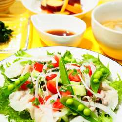 ランキングに参加してます。応援お願いします♪ 日中は汗ばむ陽気になった今日は豚しゃぶサラダを食卓に。 豚しゃぶにトマトときゅうり、フリルレタス、新玉ねぎ、スナップえんどう、スプラウトを彩りよく♪ ごま油を加えた中華風のドレッシングにはしょうがも入れて、冷え過ぎ防止^^ さつまいもとにんじんのはちみ… うちごはんはマーシャもい… 2022/05/19 23:43