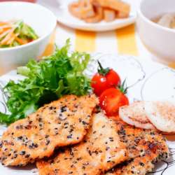 ランキングに参加してます。クリックしていただけると嬉しいです(*^_^*) タンパク質が豊富で比較的カロリーが低い鶏むね肉を主菜に。 薄いそぎ切りにして、軽く塩、こしょうをふり、小麦粉をまぶします。 いつものフライの手順で溶き卵にくぐらせたら、 パン粉に黒ごま&粉チーズを入れた変わりごろもを混ぜ合… うちごはんはマーシャもい… 2025/01/22 00:24