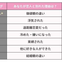 ウェブスターマーケティング株式会社は、全国の男女495人を対象に「恋人と別れた理由」に関するアンケート調査を実施し結果を発表した。 恋人と別れた理由について聞いたところ、1位は「価値観の違い」でした。 2位以下は「浮気された」「遠距離恋愛だった」と続きます。… MENTALW 2022/03/29 00:45