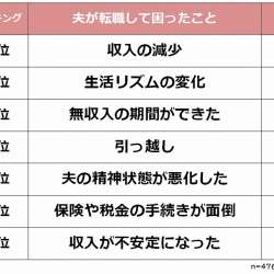 株式会社ビズヒッツは、転職経験のある夫をもつ既婚女性500人を対象に「夫の転職に関する意識調査」を実施し発表した。 転職経験のある夫をもつ既婚女性500人に「夫が転職して困ったことはなんですか?」と聞いたところ、1位は「収入の減少」でした。 2位以下にも「無… MENTALW 2021/05/29 14:18
