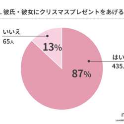 ウェブスターマーケティング株式会社は、20~50代の男女500人を対象に「クリスマスデート・プレゼントに関するアンケート調査」を実施し結果を発表した。 「はい」と回答した方が87%、「いいえ」と回答した方が13%と、恋人にクリスマスプレゼントをあげる方が圧倒… MENTALW 2021/12/31 17:53