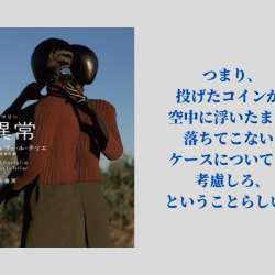 仏人作家による、ジャンル横断的な群像劇。 フランスからアメリカへ向かう旅客機が、大西洋上空で嵐に遭い、乗客や乗務員に“異常”な現象が降りかかるという話。 この“異常”によって人生が大きく変化することになった搭乗者たち […] 天竺堂通信 2023/09/05 13:23