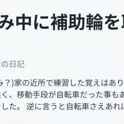夏に(夏休み?)家の近所で練習した覚えはあります。 マ イカ ーが無く、移動手段が自転車だった事もあり、自転車は必須でした。 逆に言うと自転車さえあれば生活に困らない地域でした。市は小さいし駅近いし。 どうやって練習したか覚えていない バランスを取るのが難しい 漕ぎ出しは慣れかな 私の母は40… アヒル小屋の日記 2020/03/26 15:29