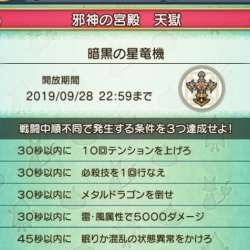 いつもと違うメンバーで 帝国三将 軍と奮闘していたら 天獄 オープン♪ 28日22:59までです。 結局、三将軍は倒せず。 天獄 も翌26日の夜に行ってきまーす。 暗黒の星竜機 考えられる対策 戦闘の様子 暗黒の星竜機 ダークネビュラスみたいなのですね。 おでかけ便利ツールの「つよさ… DQ10 こつこつおばの… 2019/09/26 10:16