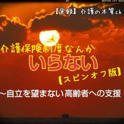 【実録】介護の本質chは 介護保険制度なんかいらない【スピンオフ版】 自立を望まない高齢者への支援 と題してお送りします。 前回、このchからお伝えした「介護保険制度なんかいらない」 投稿以降、多くの人からの反響をいただ […] 関連記事 介護保険制度なんかいらない~本質から展望までを完全網羅~ 高… Showra93’s L… 2021/11/23 18:00