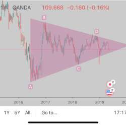 トレード戦士の世界では危険な相場の 「魔のトライアングル」 が長期的な観測で続いていますね。 なんとこれかれこれ4年くらい前から作られた魔の領域です。 三角保ちあい相場とも呼ばれたりしますがこういう時って上下3回くらい叩いた後に上か下に大きく バーーーン って突き抜けるのでとても危険なんですよ… ローソク足研究所 2019/05/17 19:05