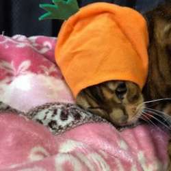 ベンガルランキングへ今日も2にゃんズは、元気にじゃれあっています♪そんな時!コスプレさせてみよう!とひらめいた飼い主!!さっそく、くうちゃんからコスプレ開始〜人参さんに大変身ー!可愛いーけど、いやがってる(;o;)歩いてどこかに行ったので、名前を呼んでみると、顔!!でも人参姿たまらーん(*´∀`*)… にゃんこのおうち 2018/04/30 10:00