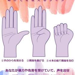 ご存知の方もいらっしゃるかと思いますが、お恥ずかしながら主は知りませんでした。声に出して助けを求められない場合の、【助けて】を伝える世界共通のハンドサイン渋谷区文化総合センター大和田助けを求める相手に①手のひらを見せて、②親指を曲げ、③4本の指で親指を包む... 猫とふたり暮らし~eva… 2023/07/11 21:00