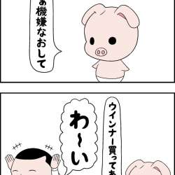 “高島のら”とヘコキブタ(嫁)の4コマ漫画です。